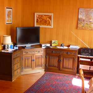 Wohnzimmer mit Holzdecke und Teppich auf Riemenboden mit TV und Radio.